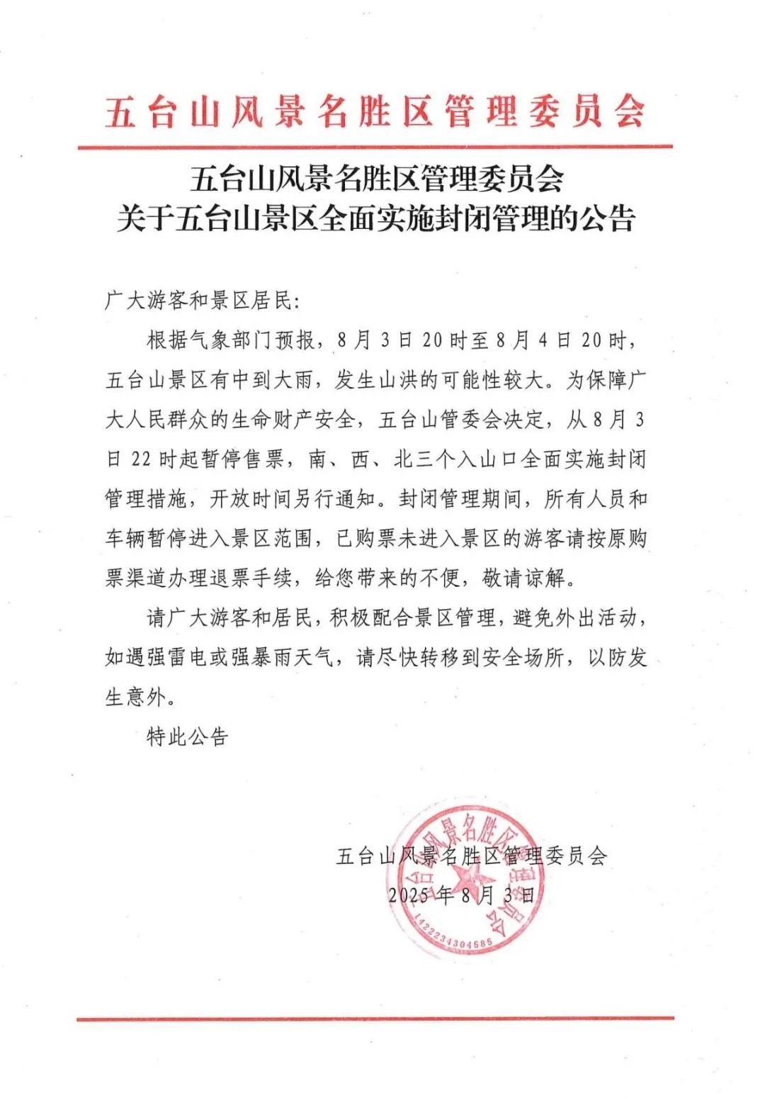 根据气象部门预报,8月3日20时至8月4日20时,五台山景区有中到大雨,发生山洪的可能性较大。为保障广大人民群众的生命财产安全,五台山管委会决定,从8月3日22时起暂停售票,南、西、北三个入山口全面实施封闭管理措施,开放时间另行通知。封闭管理期间,所有人员和车辆暂停进入景区范围,已购票未进入景区的游客请按原购票渠道办理退票手续,给您带来的不便,敬请谅解。
