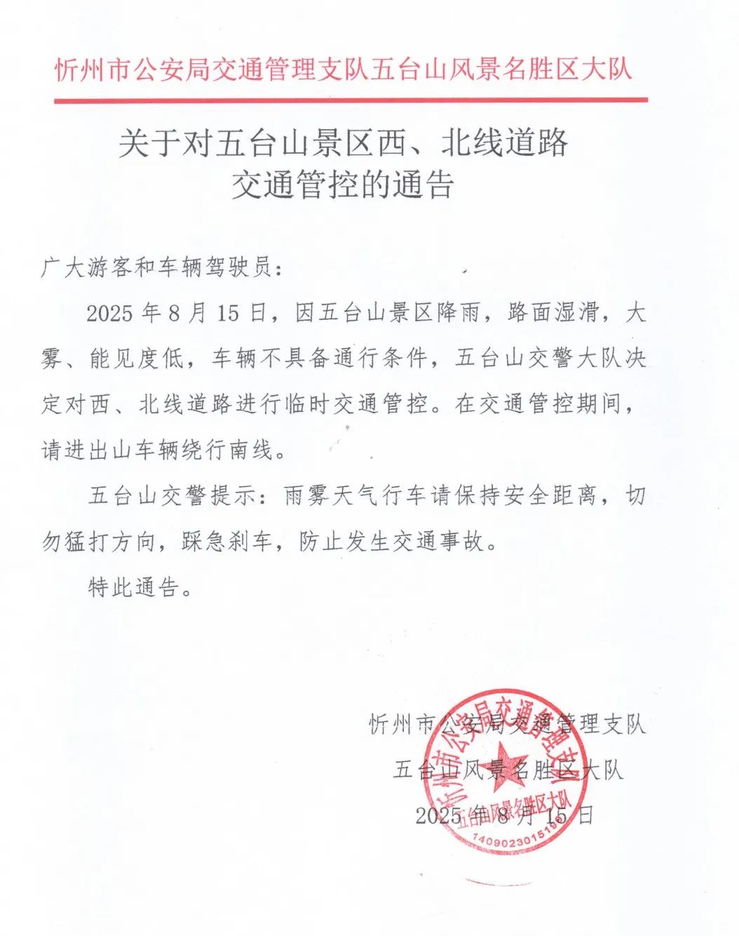 关于对五台山景区西、北线道路交通管控的通告