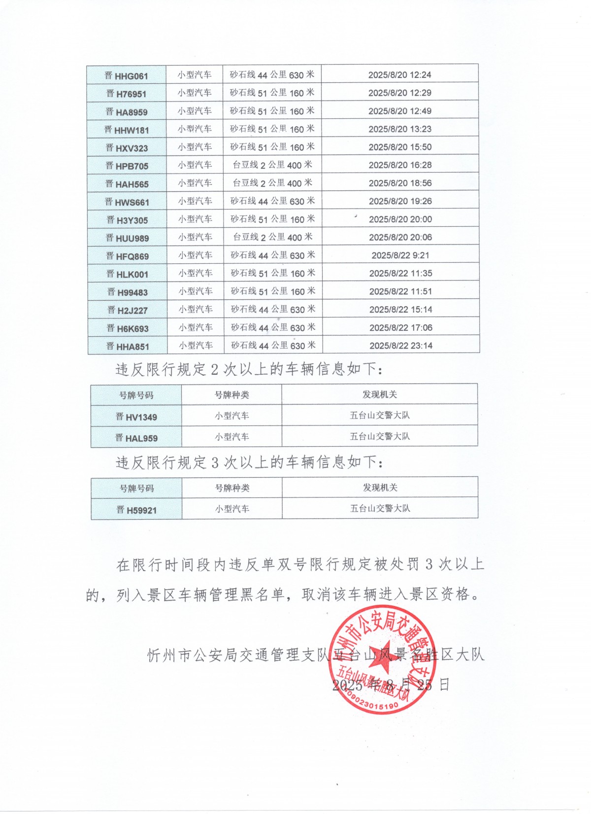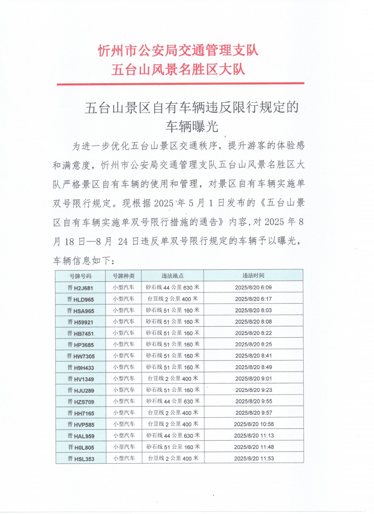 五台山景区自有车辆违反限行规定的车辆曝光