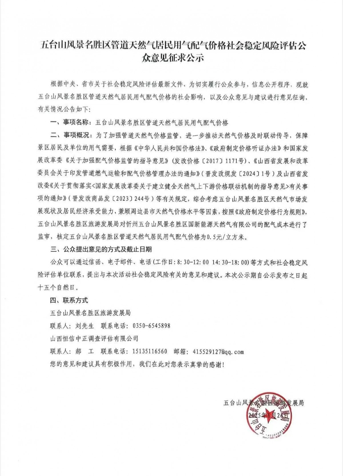 五台山景区管道天然气居民用气配气价格社会稳定风险评估公众意见征求公示