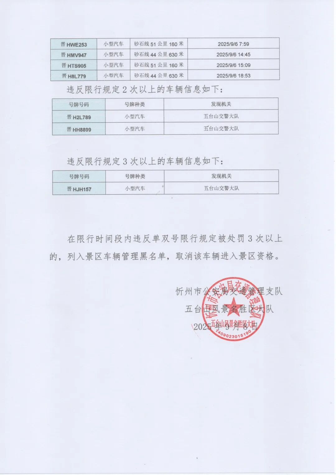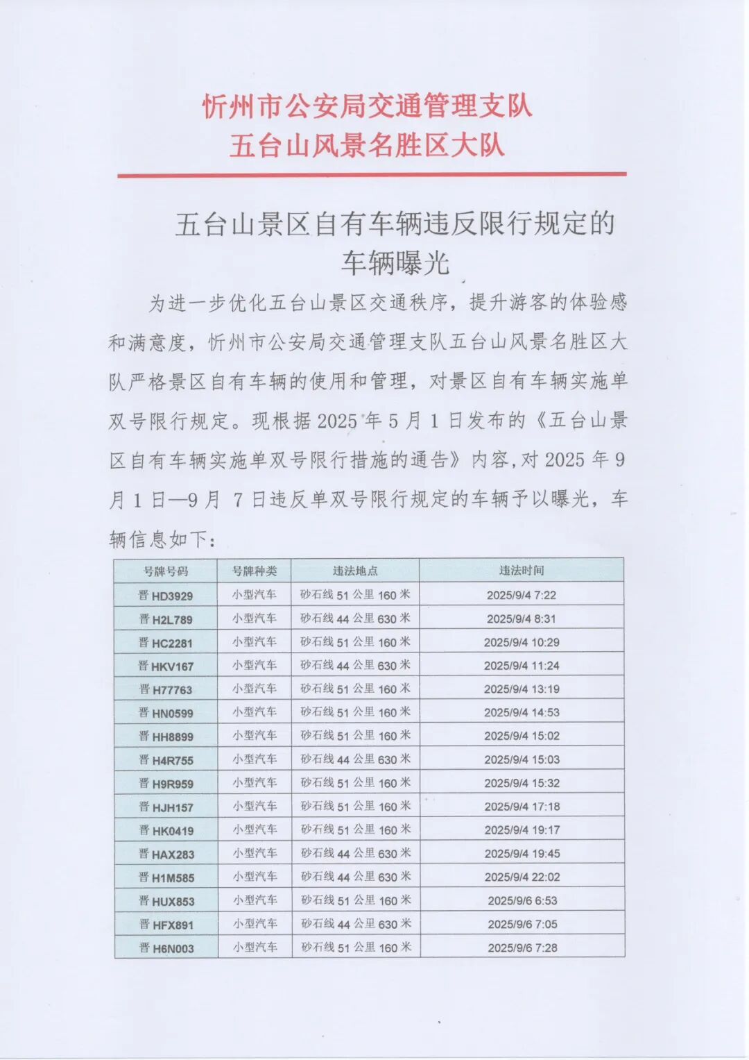 五台山景区自有车辆违反限行规定的车辆曝光