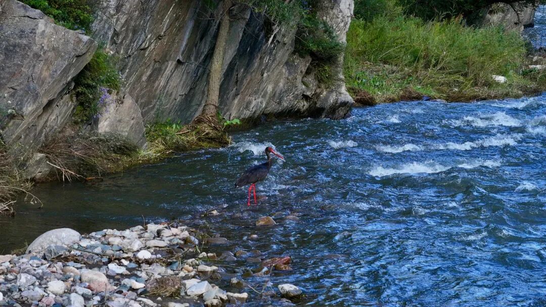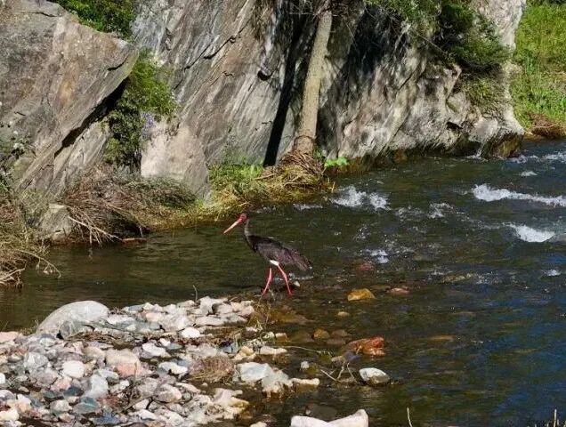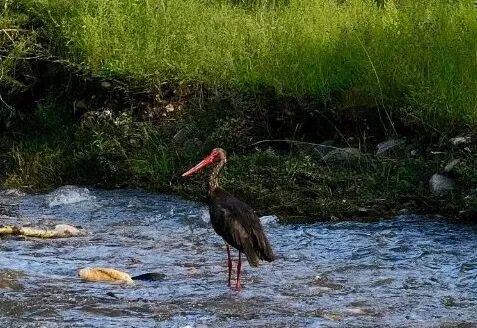 近日,五台山融媒体中心记者在景区清水河流域拍摄记录到了国家一级重点保护野生动物黑鹳的清晰影像。画面中,这只“湿地精灵”在浅水区悠然觅食,红喙长颈,姿态优雅,尽显自然之美。