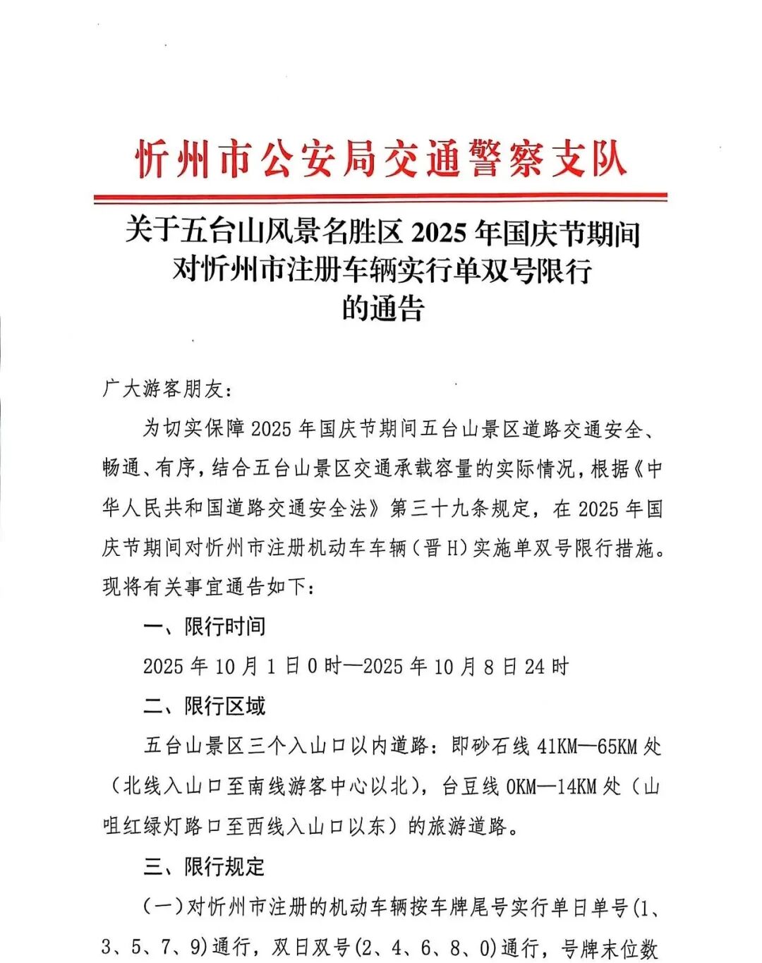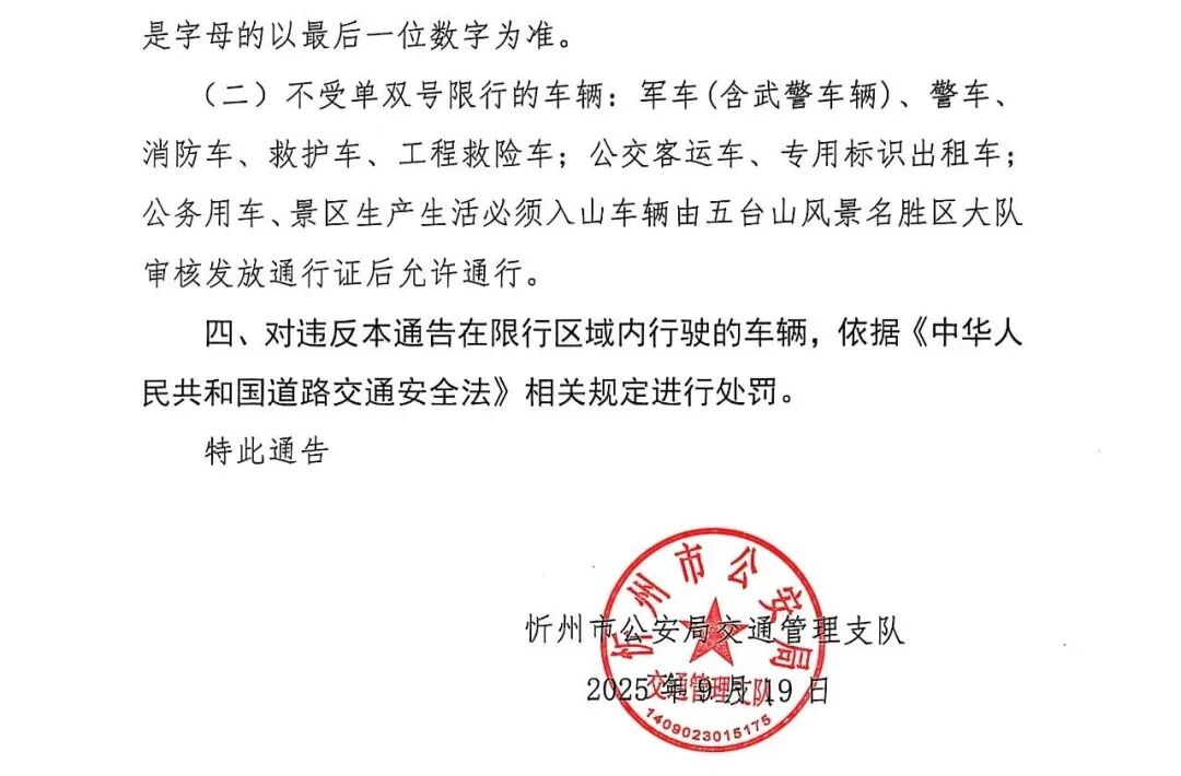 关于五台山风景名胜区2025年国庆节期间对忻州市注册车辆(晋H)实行单双号限行的通告