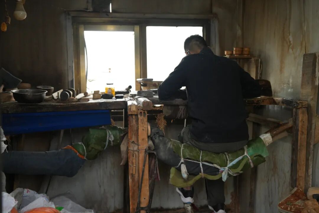 在五台山台怀镇东庄村一处静谧的农院内,一阵阵有节奏的旋床“嘎吱”声传来。传统手工木碗手艺人张斌坐在高高的旧式旋床上,凝神旋刻着一只已初具雏形的精巧木碗。他的双脚在旋床踏板上灵活地踏动,带动固定在旋轴上的木碗快速地旋转,手中的刻刀以巧妙地角度稳稳地旋切着木料。不一会儿,一只精巧独特的白桦木碗就在张斌手中成型了。