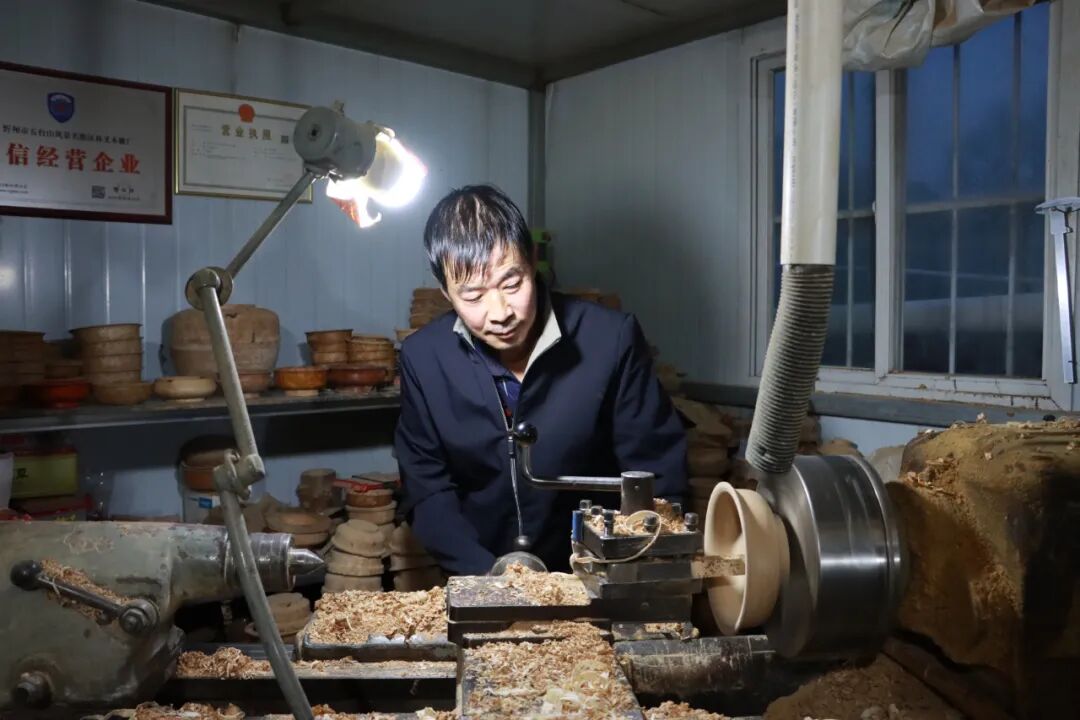 当古老技艺遇上现代机械,景区传统手工木艺在更广阔的市场焕发新生。韩林义从岳父手中接过手工木碗的班已经三十多年了,十几年前市场对手工木碗的需求变大、要求变高,为了生计为了发展韩林义咬牙购入了一辆老式手控机床。机床提高了木碗的加工效率,本就热爱手工木艺的韩林义把更多的时间和精力投入到了木艺品的创新设计上,创造了更多大众适用的生活化产品。在韩林义手下诞生的这些产品,活化手工木艺传承、增加木艺品经济附加值的同时,也进一步满足了木艺品市场的产品需求。订单越来越多,效益越来越好,韩林义趁势又购入了几台机床,还成立了自己的木雕厂,最多的时候一年能接6000多个订单。