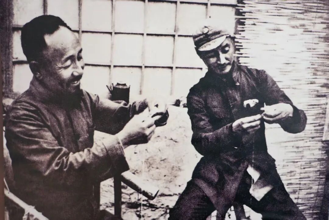 1942年,由于日寇侵略军的“扫荡”和全面进攻,边区在各个方面尤其是在经济生活上发生了严重的困难。加之又发生了罕见的旱灾,更加重了困难。为此,军区发出号召,发扬艰苦奋斗精神,军民团结一致,自力更生,开展起了大生产运动,终于战胜了困难。这是边区参议会副议长于力(左)和法院院长王裴然在捻毛线