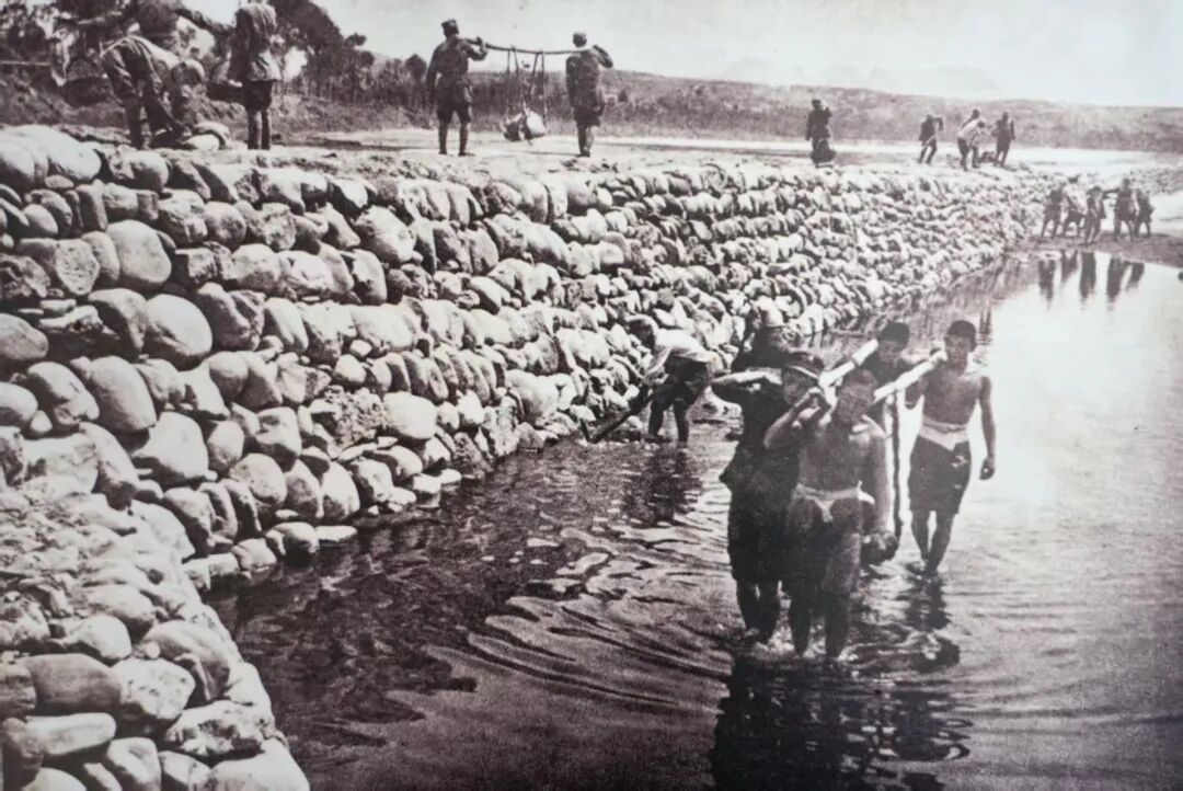 子弟兵帮助唐河两岸人民筑堤防洪