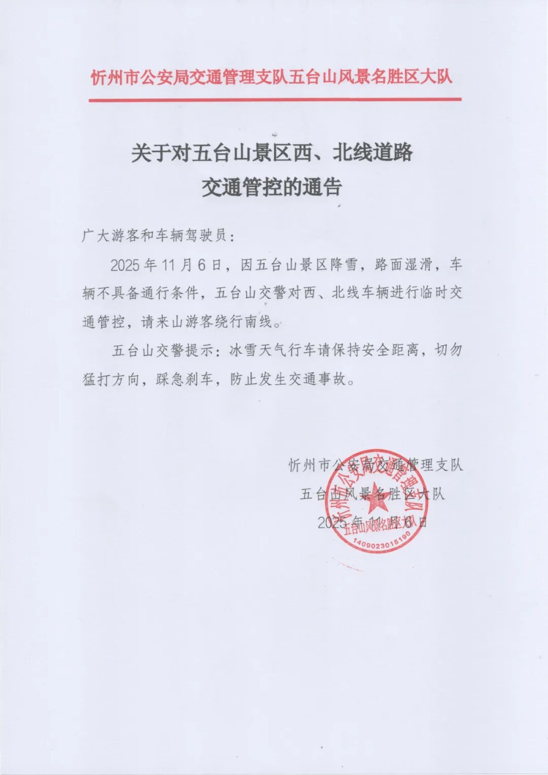 关于对五台山景区西、北线道路交通管控的通告