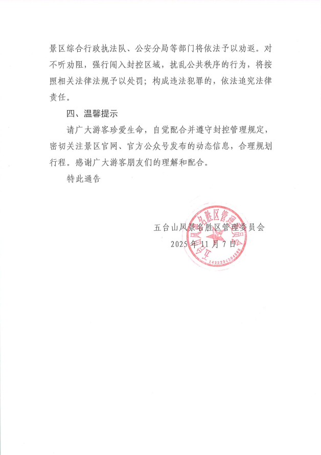 关于对五台山景区台顶及周边区域实施限期封控管理的通告