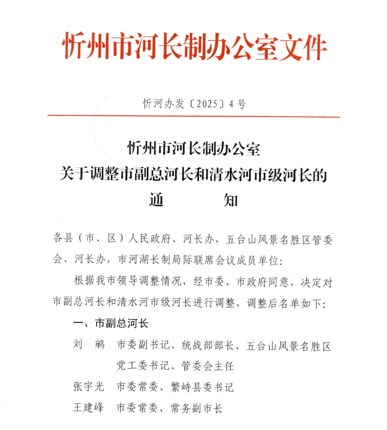 根据我市领导调整情况,经市委、市政府同意,决定对市副总河长和清水河市级河长进行调整,调整后名单如下: