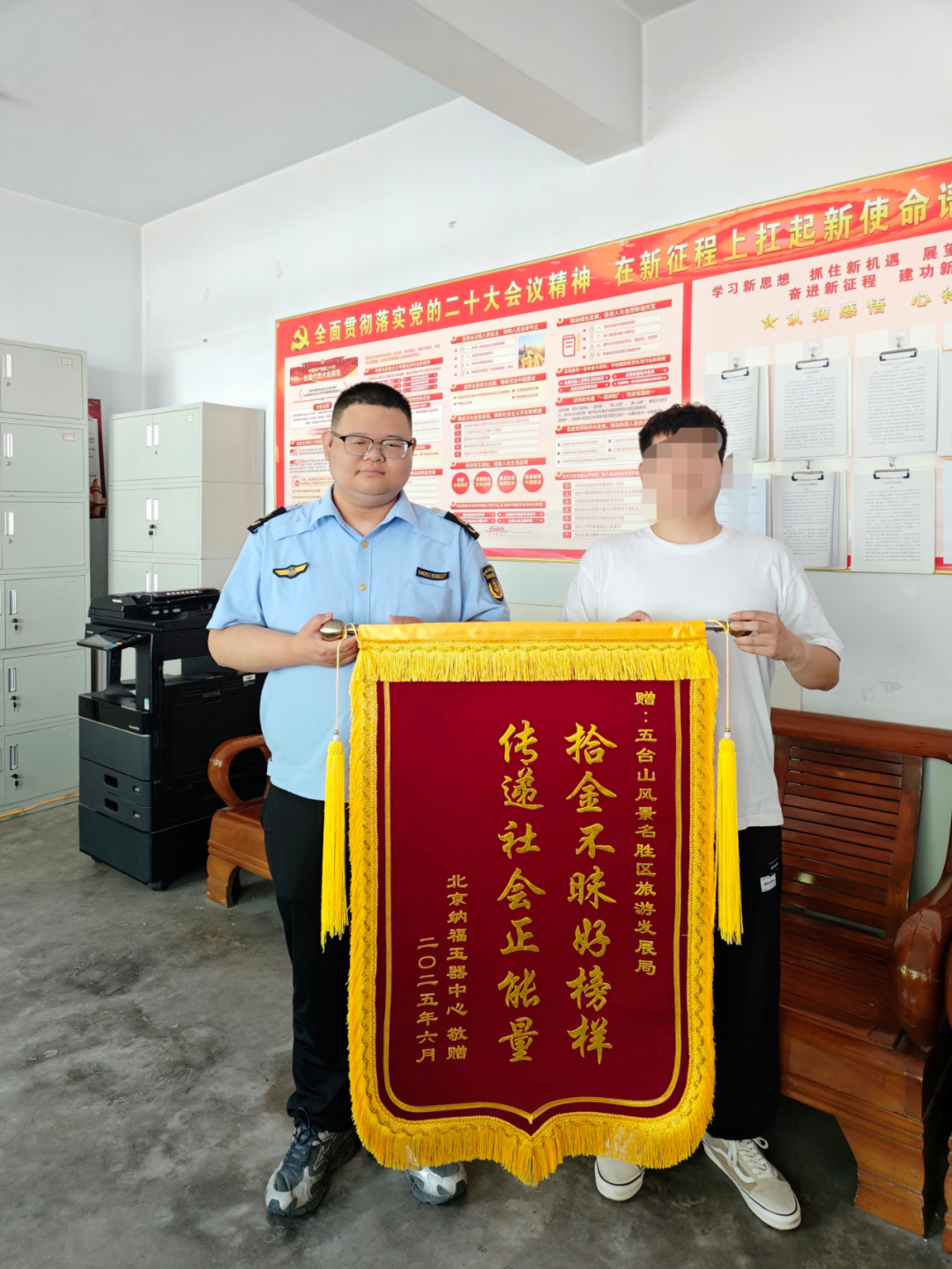 “没想到这么快就找回来了!你们真是帮了大忙!”近日,在五台山景区,一位来自北京的游客不慎将装有61件珍贵玉牌的手提袋遗落,景区有关部门多方联动、连夜查找,最终成功找回,挽回经济损失近两万元。事后,失主特意向五台山景区旅游发展局送来一面锦旗,上书“拾金不昧好榜样,传递社会正能量”,以表达由衷的感激与敬意。