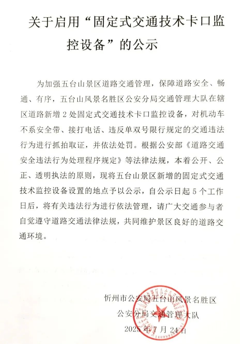 关于五台山景区启用“固定式交通技术卡口监控设备”的公示