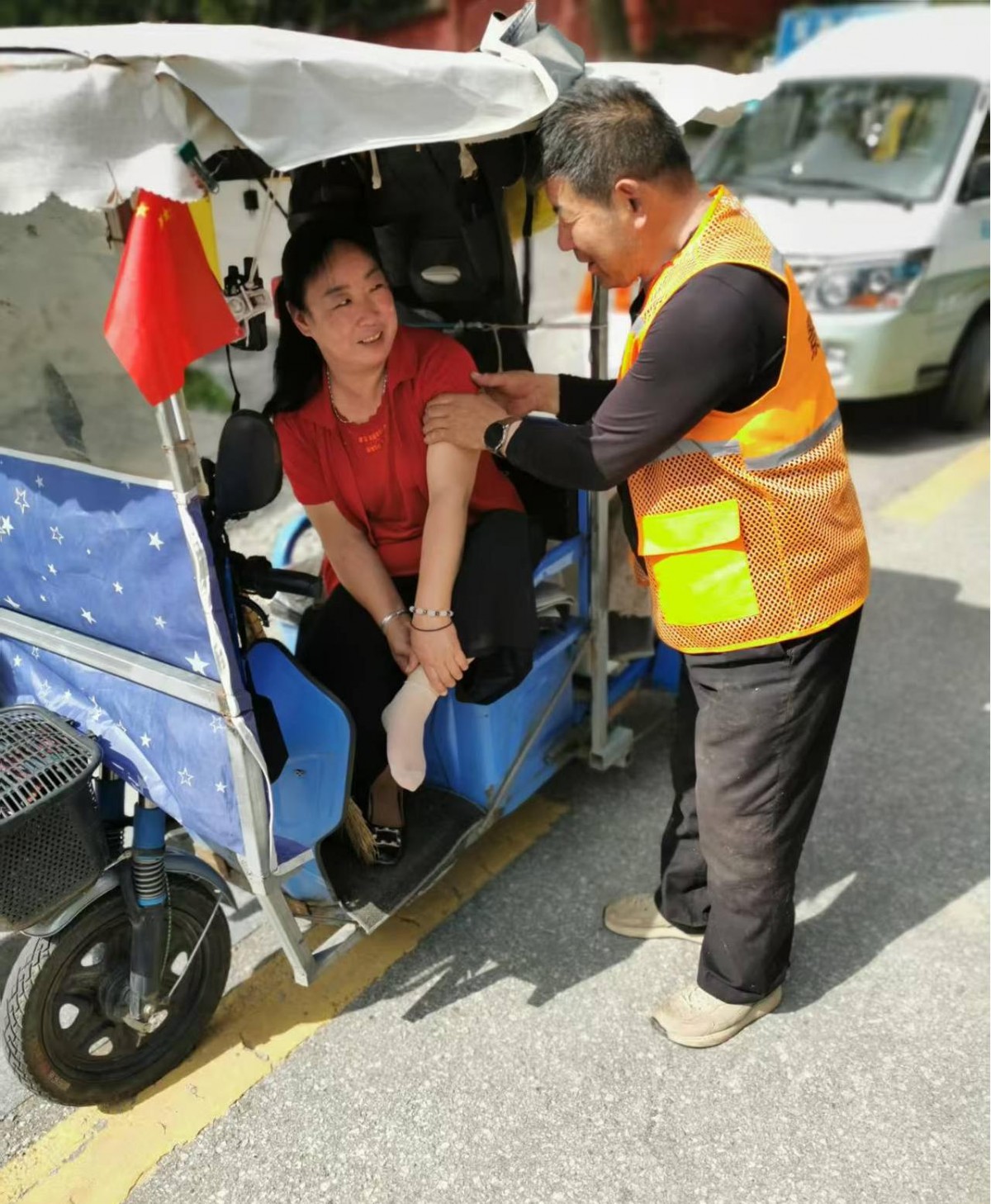 当天上午,景顺物业环卫组长杨云槐如往常一样在景区巡查保洁。突然,他留意到一名游客神情痛苦地坐在路边,身旁家属正手足无措地尝试将其搀扶起来。杨组长见状,立即快步上前询问。经了解,原来是游客在登山过程中不慎崴脚,疼痛难忍,已无法行走。考虑到山区医疗条件有限,杨云槐当机立断,一边安抚游客情绪,一边通过对讲机与车队值班领导取得联系。“伤情就是命令!”——接到报告的车队负责人即刻启动应急响应,以最快的速度安排车辆将受伤的游客送往五台山医院。由于送医及时,避免了伤势进一步恶化。游客家属握着杨组长的手连连道谢:“当时真的特别无助,多亏了杨组长,一路护送我们到医院,太感谢了!”而面对赞誉,这位朴实憨厚的环卫工作者只是轻轻摆手:“这都是分内事,每个五台山工作人员遇到这种情况,都会毫不犹豫地这么做,游客在景区平平安安的,我们就放心了。”